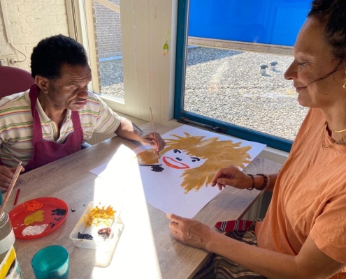 In de dagbesteding ‘De Elzen’ werkte ik jarenlang samen met kunstenaar Michael Boldewijn. Samen schilderden we vele supersterren, zangers en roofdieren, alle op groot formaat 50x 70. Michael heeft een voorliefde voor het schilderen van grote tanden en neushaar. Hij is fan van de Paus de XXIII , de Hulk en bami. Hij zingt “Jealous Guy’ van Brian Ferry mee met tranen in zijn ogen.